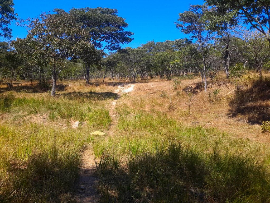 After about a good 15 minutes we got to a place which was dotted with some slim trunked trees stretching over a large area and I wish I had recorded the music provided by the birds there. I bet Jumbo was also enjoying this too. The trail wasn’t so defined but clear enough to show there were more trees ahead of us. At one point, I noticed Jumbo was distracted by the grass when we paused for a bit. It was time for free tasting for him.